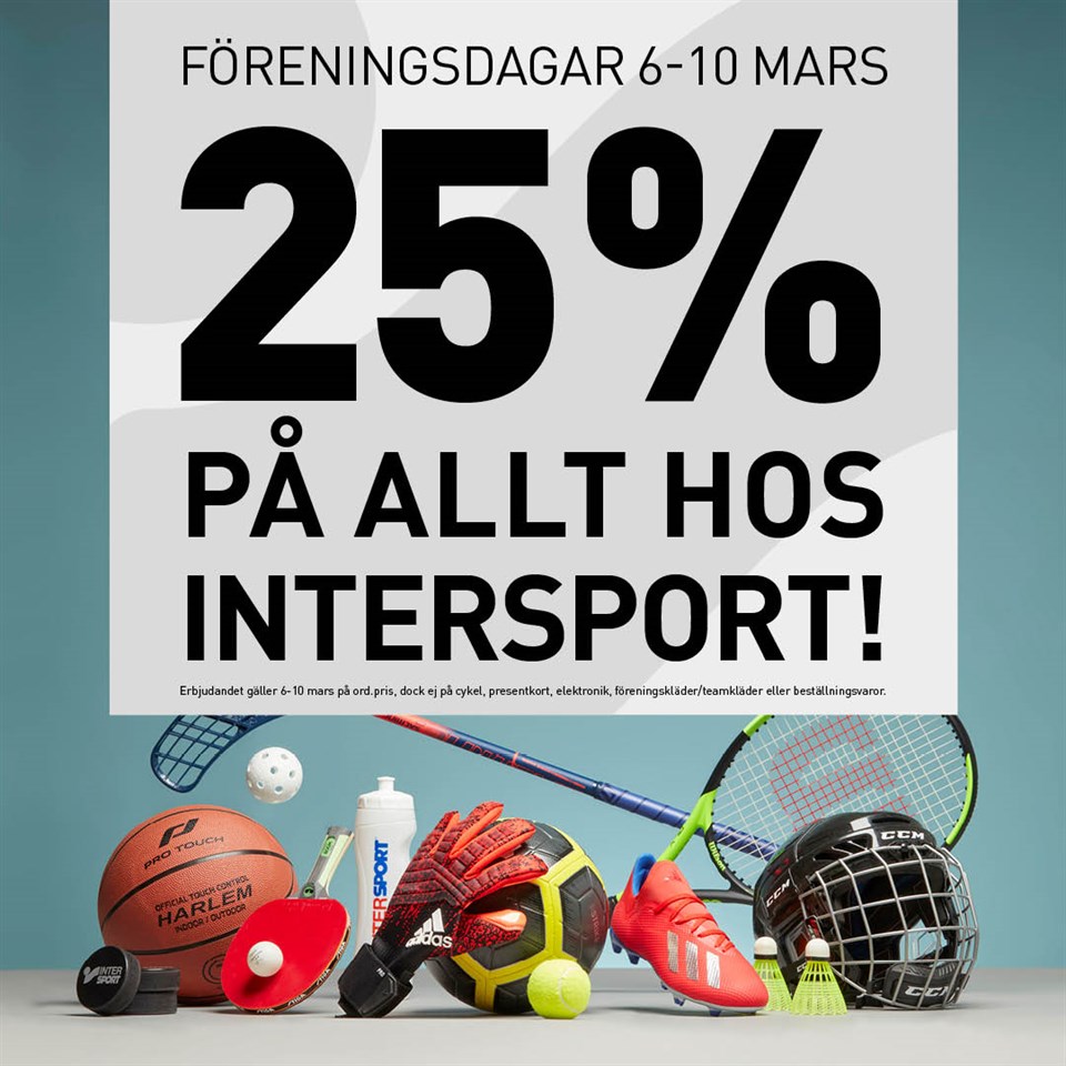 Den 6-10 mars önskar vi alla medlemmar välkomna på exklusiva föreningsdagar hos vår samarbetsparter INTERSPORT! Som medlem får du 25% rabatt på allt i butiken* och samtidigt stöttar du din förening. Visa upp detta inlägg i kassan för att erhålla rabatten eller använd följande rabattkod: 9982019090108 på intersport.se. Alla köpen ger sedan pengar tillbaka till din förening. *Erbjudandet gäller 6-10 mars på ord.pris, dock ej på cykel, presentkort, elektronik, föreningskläder/teamkläder eller beställningsvaror.