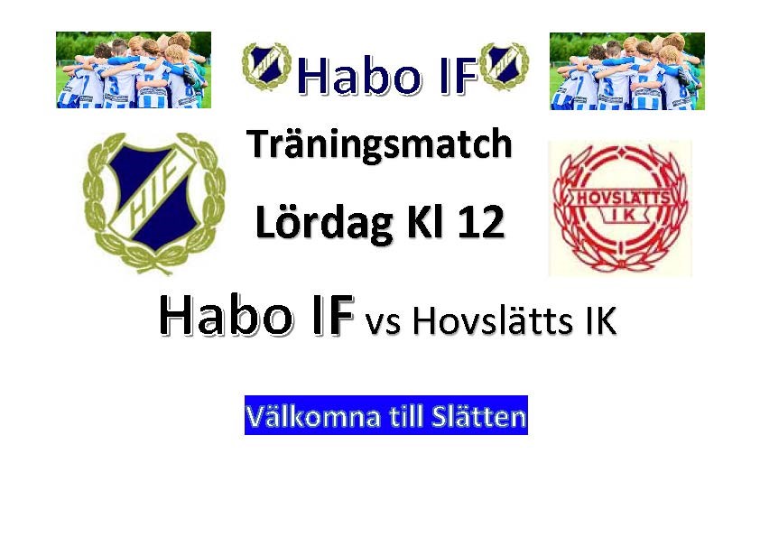På Lördag kl 12 så är det dags för seniorlagets första träningsmatch. Hovslätts IK står för motståendet på konstgräset på Slätten. Hela schemat för träningsmatcherna ser ut enligt följande: 2 feb Habo IF - Hovslätt 23 feb Bankeryd - Habo IF 2 mars Habo IF - Aneby 9 mars Ljungby - Habo IF 16 mars Habo IF - Waggeryd 23 mars Ulricehamn - Habo IF 30 mars IFK Hjo - Habo IF 6 april Habo IF - Ekhagen 13 april Habo IF - Ekedalen