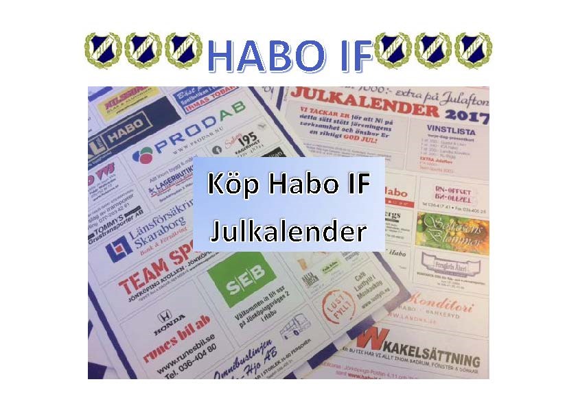 Fredag 3 november med start vid kl 10 så kommer vi att finnas utanför ICA och sälja årets Julkalender. Pris 20 kr Vi kommer att finnas på plats med jämna mellanrum så länge det finns kalendrar kvar. Så köp Julkalendern och stöd Habo IF.
