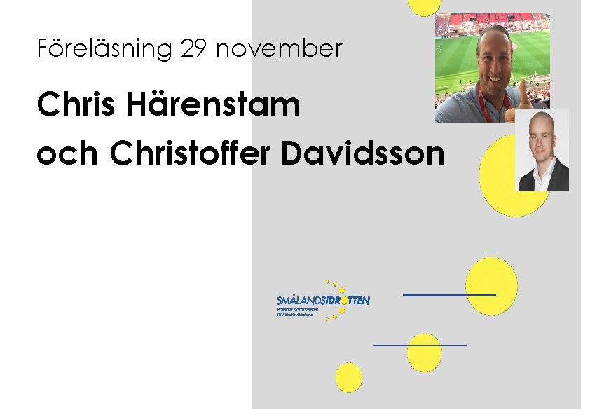 – Hur skapar vi en sund, hållbar och utvecklande barn- och ungdomsidrott? Välkommen du som är barn- och ungdomsansvarig i en idrottsförening, förälder till ett barn i en förening, ledare/funktionär/tränare, styrelsemedlem eller du som bara är intresserad av barn- och ungdoms- idrottsfrågor. Under kvällen kommer Chris Härenstam, sport- journalist och kommentator för SVT, tillsammans med Christoffer Davidsson, barn- och ungdomsansvarig i HV71, att berätta om deras syn på barn- och ungdomsidrott och vad de gjort i sina respektive idrottsföreningar. De kommer reflektera över frågor som till exempel: • Vad står vår förening för? • Vad vill vår förening med vår barn- och ungdomsidrott? • Varför slutar barn och ungdomar i våra föreningar? • Tabellernas vara eller icke vara? • Går det att bedriva en verksamhet där alla är nöjda? Vi garanterar dig att kvällen bjuder på mycket inspiration så missa inte detta! När: Onsdag den 29 november 2017, kl. 18.00- ca. 20.30. Var: Jönköping, First Hotel, Ryhovsgatan 3-5 (M2-gruppen, f.d Eurostop) OBS! NY PLATS/LOKAL Kostnad: Kostnadsfritt Anmälan: Anmälan ska senast 22 november vara Smålandsidrotten tillhanda. Anmälan kan göras här eller mejlas till lena.moberg@smalandsidrotten.se. Uppge alltid namn, personnummer och förening vid anmälan. Begränsat antal platser så först till kvarn gäller! Kallelse: Ingen kallelse kommer att skickas ut. Bekräftelse på gjord anmälan gäller som plats på föreläsningen. Eventuella återbud SKA lämnas till Smålandsidrotten, tel. 036-34 54 29 eller lena.moberg@smalandsidrotten.se. Om återbud inte lämnas debiteras 250:-. Information: För ytterligare information kontakta Elin Hornbrink på tel. 036-34 54 38, eller via mejl elin.hornbrink@smalandsidrotten.se.