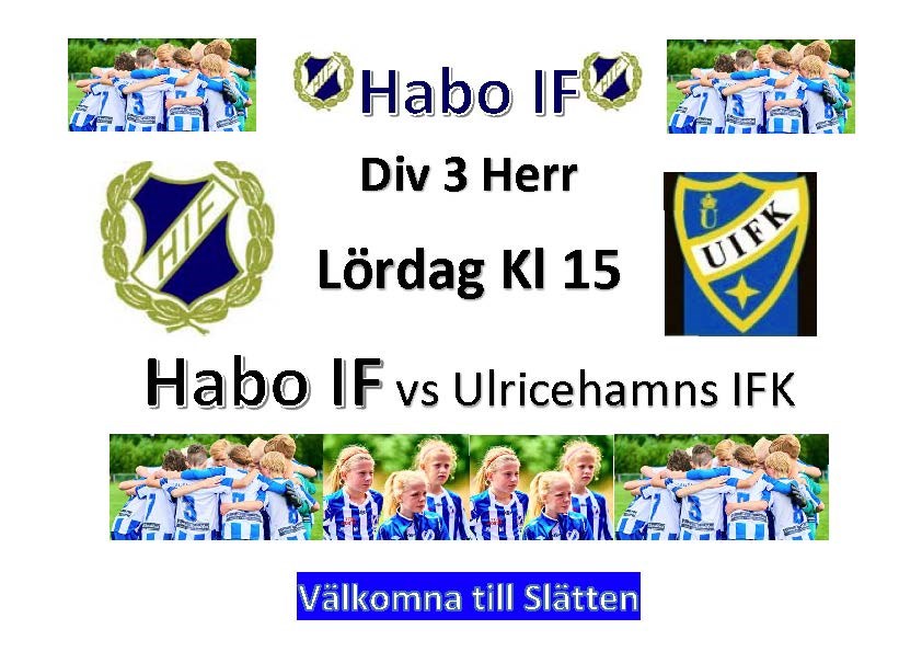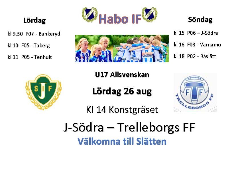 Det är en helg som bjuder på 9 matcher på Slätten där både Herr och Dam spelar hemma. Herrarna får besök av Ulricehamns IFK med start kl 15 på lördag. UIFK som är väldigt bekant för oss i Habo IF. UIFK som de senaste åren haft ett stort deltagande i Habo Honda Cup. Missa inte detta. Men redan på fredagen är det match kl 18,30. P04 tar sig an Skillingaryds IS. Lördagen bjuder på dubbla Hovslätt möten, både för F07 och F05 med start 11 respektive 12. 13,30 är det lite förmatch på 7-manna plan. P05 tar emot Bankeryd. Kl 15 är det herrarna mot UIFK. Under söndagen är damernas tur med start kl 17 gästas man av Egnahem. Redan på förmiddagen kl 11 så spelar P07 mot Ölmstad. Direkt efter det är F06 i farten kl 12 och möter då Bottnaryd. F04 har precis som damerna matchstart kl 17. F04 tar sig an Barnarp. Välkomna till en härlig helg på Slätten. Fredag 18:30 P04 Habo IF - Skillingaryds IS Lördag 11:00 F07 Habo IF - Hovslätts IK Lördag 12:00 F05 Habo IF vit - Hovslätts IK Lördag 13:30 P05 Habo IF blå - Bankeryds SK svart Lördag 15:00 Div 3 Mellersta Götaland, Habo IF - Ulricehamns IFK Söndag 11:00 P07 Habo IF vit - Ölmstads IS Söndag 12:00 F06 Habo IF - Bottnaryds IF Söndag 17:00 F04 Habo IF - Barnarps IF Söndag 17:00 Div 3 Dam Habo IF - Egnahems BK