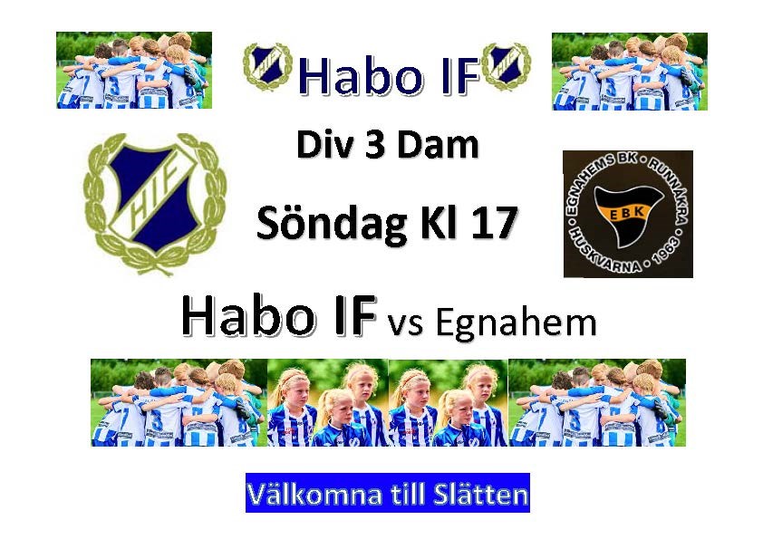 ..dagens matcher på Slätten. Idag är det damernas tur med matchstart kl 17 gästas man av Egnahem. Missa inte, redan på förmiddagen drar det igång. Kl 11 så spelar P07 mot Ölmstad. Direkt efter det är F06 i farten kl 12 och möter då Bottnaryd. F04 har precis som damerna matchstart kl 17. F04 tar sig an Barnarp. Välkomna till en härlig helg på Slätten. Söndag 11:00 P07 Habo IF vit - Ölmstads IS Söndag 12:00 F06 Habo IF - Bottnaryds IF Söndag 17:00 F04 Habo IF - Barnarps IF Söndag 17:00 Div 3 Dam Habo IF - Egnahems BK