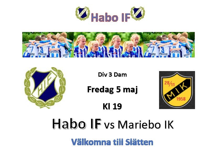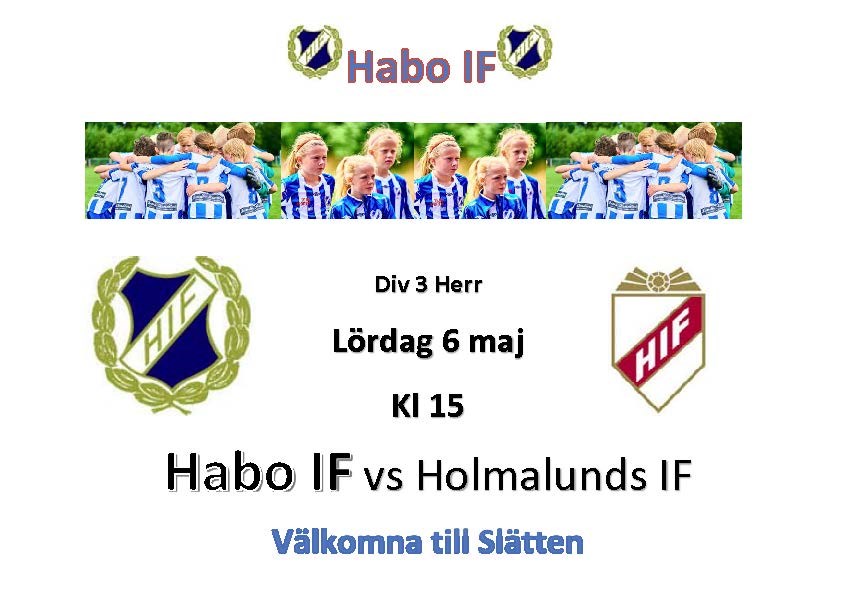 Lördag kl 15 är det dags för herrarnas andra hemmamatch i trean. Efter två raka bortamatcher är det dags för hemmaplan igen. Efter poäng borta mot Råslätt så blev det förlust i Alingsås mot Gerdsken på en allt annat än bra fotbollsplan. Nu är det dags för match mot ett annat Alingsås lag, Holmalunds IF. Ett lag som hittills spelat in 6 poäng. Mest kännt för att vara moderklubb för landslagets Johan Elmander. Lördag kl 15 Div 3 Herr Habo IF - Holmalunds IF Vi påminner även om dammatch ikväll: kl 19 Habo IF - Maribo IK Det bjuds på mer fotboll i helgen. Lördag 10:00 P06 Habo IF blå - Bankeryds SK gul Lördag 11:00 F03 Habo IF - Bankeryds SK Lördag 13:00 P02 Habo IF - Myresjö/Vetlanda FK Lördag 15:00 Div 3 Herr Habo IF - Holmalunds IF Alingsås Söndag 10:30 P04 Habo IF 1 - Gnosjö IF 1 Söndag bjuds det även på poolspel för F08 kl 10-13. Deltagande lag: Habo IF, Bankeryds SK, Mariebo IK
