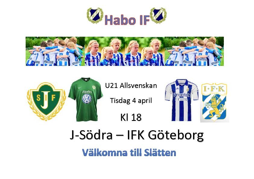 Tisdag 4 april kommer det bli spel i U21 Allsvenskan på Slättens konstgräs. U21 allsvenskan består av de allsvenska lagens U21 lag. Det gör att de kan mycket väl dyka upp allsvenska spelare i de båda lagen. Flera av spelarna i dessa lag ingår i de båda föreningarnas framtidssatsningar. J-Södra marknadsför sig som ”Byggdens Lag” och vill spela en del matcher på andra orter. När J-Södra tog kontakt tyckte vi att detta är en spännande och intressant match att kunna visa på Slätten. Motståndet är välkänt för de flesta: ”Änglarna” ”Blåvitt” ”Kamraterna” Kärt barn har många namn. IFK Göteborg har en fin fotbollskultur och flera av oss minns UEFA framgångarna på 80-talet. Det ska bli spännande och kul att spana in föreningarnas framtidstalanger. Tisdag 4 April kl 18 J-Södra – IFK Göteborg U21 Allsvenskan Läs om regelverket för U21 här. Se tabellen för U21 allsvenskan här