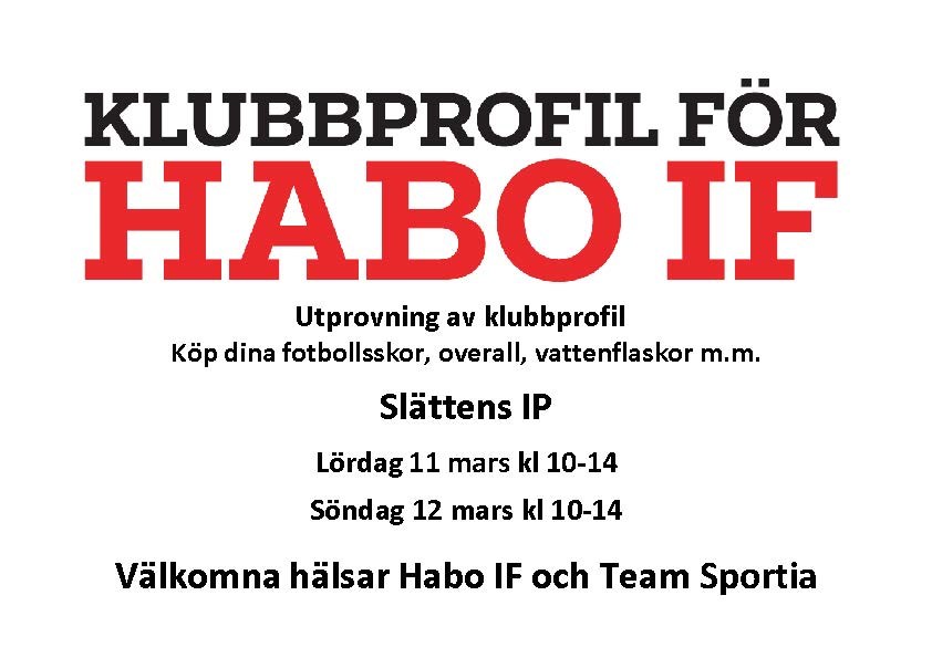 Nu är det dags att beställa ny klubbprofil. Lördag 11 mars och söndag 12 mars mellan kl 10-14 så kommer Team Sportia finnas på plats på Slätten. Passa på att beställa ny overall eller köpa nya fotbollsskor eller annat som behövs inför kommande säsong. Välkomna till Slätten. Hälsar Habo IF och Team Sportia
