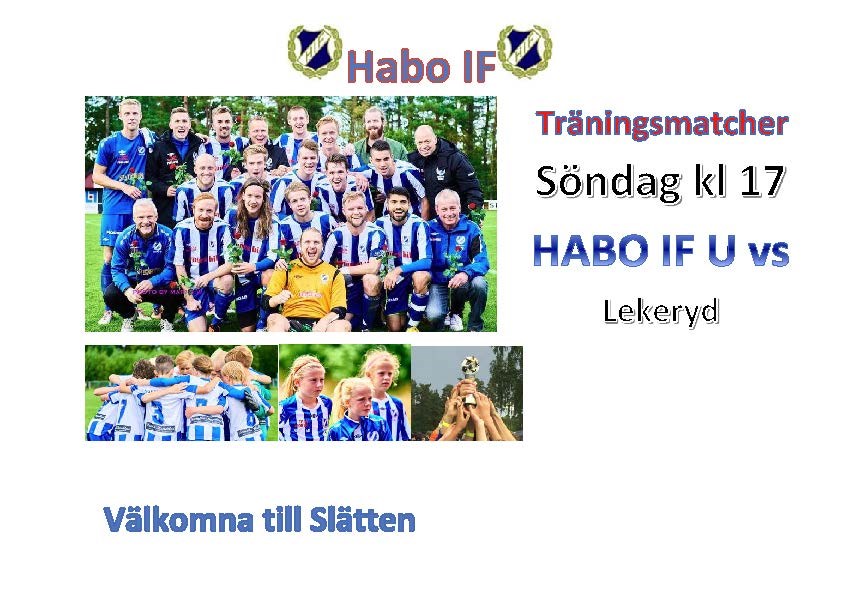 På lördag så beger sig Herrarna till Tidaholm för math mot seriekollegan IFK Tidaholm med matchstart kl 14. På söndag så kan ni se fotboll på Slätten Herrarnas U-lag tar sig an Lekeryd kl 17. Damerna är spellediga i helgen då F16 är på Futsal cup. Så helgens fotboll: Söndag kl 17 Habo IF U - Lekeryd Välkomna