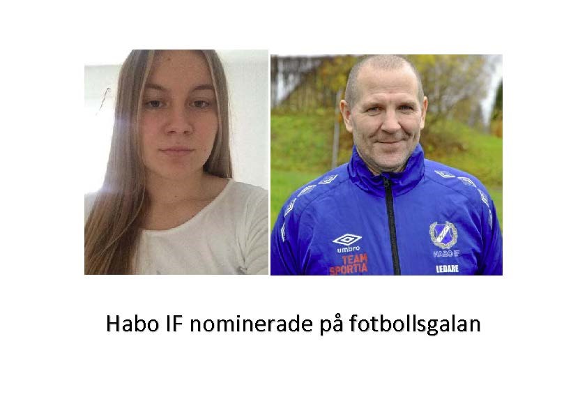 Nu på lördag så går Jönköpings Fotbollsgala av stapeln. Habo IF har spelare/ledare nominerade i två av klasserna. Jättekul ! Wilma Ihrman är nominerad i klassen årets anfallare och Lars Nordgren som årets ungdomsledare. Habo IF önskar båda Lycka till på lördag. Här är de nominerade anfallarna: Wilma Ihrman, Habo IF: Trots sin unga ålder har 18-åringen dragit ett stort lass i Habos division 2-lag den här säsongen. Sju mål blev det för anfallaren som har visat upp många kvaliteter den här säsongen. Erika Ludvigsson, Husqvarna FF Blev tvåa i den interna skytteligan under säsongen i division 2. Är en nyttig spelare som banar väg för sina lagkamrater och som kan skapa chanser på egen hand Pawel Cibicki, J-Södra Succé-lånet från Malmö FF har satt avtryck i Jönköping under 2016. Växte fram till den målskytt J-Södra hoppades på i allsvenskan. Förutom mål bidrar Cibicki med hårt jobb och bra spelförståelse. Arber Hasani, Husqvarna FF: Kom från Tenhult inför den här säsongen och satte avtryck direkt. Stod för elva fullträffar i division 1 den här säsongen och bidrog starkt till att HFF klarade nytt kontrakt Här är de nominerade till årets ungdomsledare: Lars Nordgren, Habo IF: Ansvarig för ungdomsverksamheten i Habo IF och drar ett tungt lass för att utveckla den sektionen. Är också ledare för klubbens P04-gäng och är en av hjärnorna bakom Habo Honda Cup. Raymond Håkansson, Mariebo IK: Har varit verksam sedan 2006 och är nu tränare för klubbens P99-lag. Har också jobbat hårt för att få så många som möjligt att fortsätta spela fotboll och stanna kvar i föreningen. En glädjespridare. Petra Åkerlund, Mullsjö IF: Ledare för Mullsjös F02-lag och också ungdomsansvarig i föreningen. Gör ett gott jobb med spelarna i F02-gänget och lär dem på ett pedagogiskt sätt fotbollens värderingar samt taktiska och tekniska färdigheter. Sofia Hillenborg, IK Vista: En engagerad ledare som tar ett stort ansvar. Är driven, intresserad och gillar att vara involverad i frågorna som rör IK Vista och P06-laget som hon tränar. Ett lag som för övrigt har lyckats bra med "föräldraatmosfären" runt matcherna.