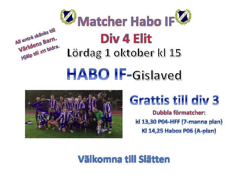 Nu på lördag kl 15 spelar herrarna sista matchen i div 4. Gislaved kommer på besök. Avancemanget till div 3 nästa år är redan klart. 39 år sedan senast. Härligt. Vi hoppas på storpublik. Alla entréavgifter kommer att skänkas till Världens Barn så kom och bidra du med. Det kommer att spelas dubbla förmatcher. kl 13,30 avslutar P04 sitt seriespel mot HFF (7-manna plan). kl 14,25 så kommer P06 spela match på A-plan. Lördag och Söndag är sista helgen att kunna spela minigolf för året, så passa på. Så kom i tid till årets säsongsavslutning. Välkomna till Slätten Habo IF 29 sep 2016 0kommentarer