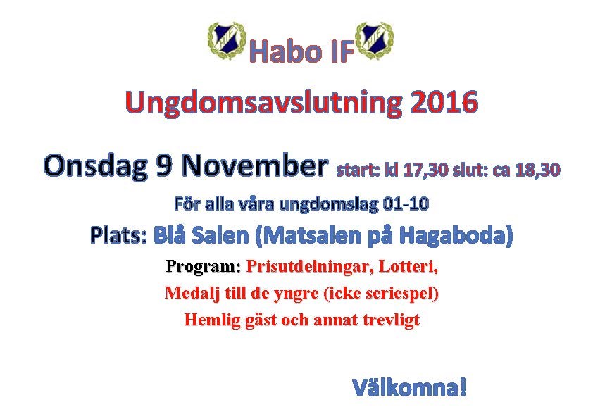Habo IF bjuder in till gemensam ungdomsavslutning för våra ungdomslag. Onsdag 9 november kl 17,30 i Blå Salen (matsalen på Hagaboda). Tränings och utvecklingspriser till seriespelande lag Medalj till icke seriespelande lag Lotteri Hemliga gäster Vi håller på ca 1 timme Välkomna Habo IF 9 okt 2016 0kommentarer