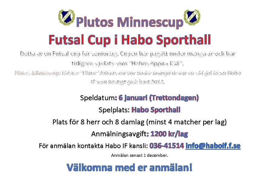 Nu öppnar vi anmälan för Plutos Minnescup. Cupen spelas 6 januari i Habo Sporthall. Vi har plats för 8 dam respektive herrlag. Anmälan sker enligt annons till Habo IF kansli. Habo IF 19 okt 2016 0kommentarer