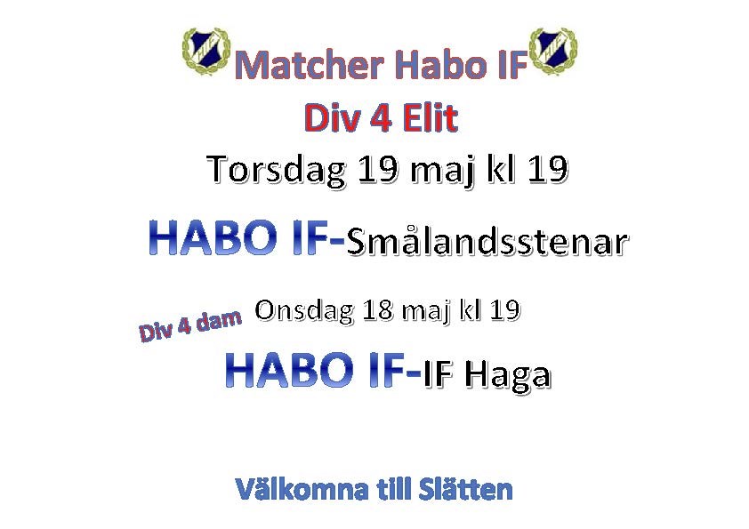 Denna vecka bjuds det på hela 4 seniormatcher på Slätten. Då båda herrlagen och båda damlagen spelar hemma. Härligt!! Vi tar det som som händer tisdag, onsdag och torsdag först. (Ny annons kommer på fredag) På torsdag kl 19 är det dags för match i div 4 elit då Smålandsstenars GoIF kommer på besök. SGOIF har som nykomling fått en bra start med 2 segrar och 3 förluster. Nu senast förlust 1-2 mot Råslätt. Habo har på 5 matcher endast 1 förlust, men också bara 1 seger. Övriga matcher har blivit oavgjorda. Senast 2-2 borta mot Anderstorp. Det gör att lagen parkerar precis efter varandra i tabellen. Nu är det dags för årets första hemmaseger. Redan på onsdag kl 19 så är det match i div 4 dam. Derby mot Haga. Missa inte heller de matcher som spelas idag (tisdag). kl 19 P01 mot Taberg kl 19 F02 mot Mariebo Vi lovar en häftig vecka så håll utkik på fredag för kommande program till helgen. Välkomna till Slätten