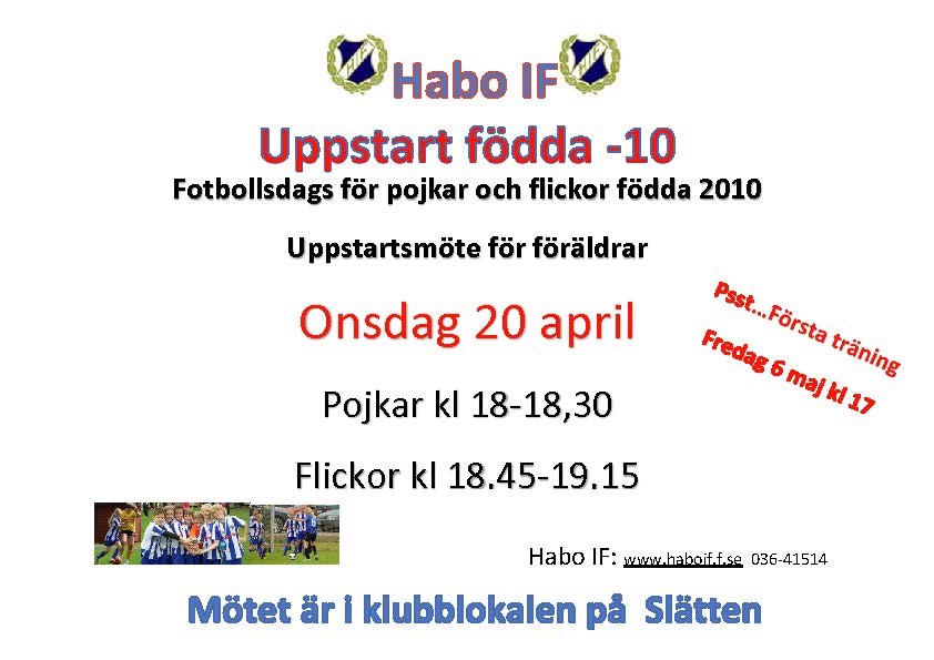 Fotbollsdags för pojkar och flickor födda 2010 Uppstartsmöte för föräldrar Onsdag 20 april Pojkar kl 18-18,30 Flickor kl 18,45-19,15 Mötet är i klubblokalen på Slätten. Frågor om uppstarten kontakta Habo IF kansli: info@haboif.f.se eller 036-41514 Psst…Första träning Fredag 13 maj kl 17