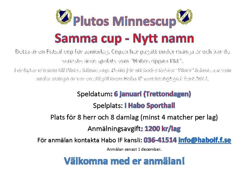 Traditionsenligt så spelas det varje år innefotboll (Futsal) trettonhelgen i Habo Sporthall. Cupen har en lång historia och spelades från början som kommunmästerskap, då det fanns många föreningar i kommunen. Gustav-Adolf, Brandstorp, Furusjö, Aledal och Habo IF. Under de senaste åren i takt med att antal föreningar i kommunen minskat så har det spelats som ”Öppna KM” och det har även varit en damklass. Speldatum blir 6 Januari (Trettondagen) i Habo Sporthall. Nytt namn blir: Plutos Minnescup Detta för att hedra vår eldsjäl Krister ”Pluto” Johansson som hastigt gick bort 2014. Vi har plats för 8 herr och 8 damlag. Info om anmälan se annons.