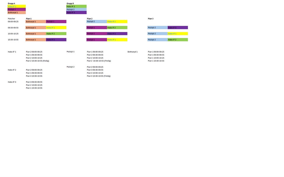 Varmt välkomna till söndagens poolspel på Slätten! Vi är fem Habo-lag och alla kommer få spela fyra matcher vardera. Hallby kommer med tre lag, och Mullsjö två lag. Matcherna kommer spelas på plan G, samma planer som vi tränar på. Samling är 09:00 på den stora altanen mellan klubbstuga och bollförrådet. Varje barn söker upp sina respektive ledare. Kom gärna ombytt, ledarna delar ut matchtröjor. I anslutning till matchplanerna kommer vi att ha försäljning av grillad korv med festis/dricka/kaffe. All försäljning går till vår egen lagkassa. Grillningen bemannas av er föräldrar, se schema nedan. Passar inte tiden, ansvarar ni för byte själva. Under höstens poolspel får resterande föräldrar hjälpa till med grillningen. Grillschema: 10:30-11:30 Alice Fernström, Alva Lingsarve, Ebba Isaksson, Alice Thelin, Alice Jelvestam 11:30-12:30 Elina Ring, Ella Fransson, Ellen Glimhall, Ebba Gillek, Ebba Svensson 12:30-13:30 Engla Krantz-Molin, Felicia Wärnbring, Fia Kärnhall, Elsie Claesson, Elvira Holstein Vi hoppas på fint väder, bra fotboll och gemenskap så det blir en härlig dag för våra duktiga tjejer. Det är trångt mellan spelplanerna så föräldrar får gärna stå bakom staketet eller i slänten, men mellan planerna vill vi bara ha lag/avbytare. MATCHER (Speltid - 2x10min) Plan 1 09:30 Hallby 1 - Habo 2 10:00 Mullsjö 1 - Habo 1 10:30 Hallby 3 - Habo 2 11:00 Hallby 2 - Habo 1 11:30 Habo 2 - Mullsjö 1 12:00 Hallby 3 - Mullsjö 2 12:30 Habo 2 - Habo 3 Plan 2 09:30 Habo 3 - Hallby 2 10:00 Hallby 3 - Habo 5 10:30 Hallby 2 - Mullsjö 1 11:00 Habo 4 - Habo 5 11:30 Habo 1 - Hallby 3 12:00 Habo 4 - Hallby 2 12:30 Habo 4 - Hallby 3 Plan 3 09:30 Habo 1 - Mullsjö 2 10:00 Habo 4 - Mullsjö 2 10:30 Habo 3 - Hallby 1 11:00 Habo 3 - Mullsjö 2 11:30 Hallby 1 - Habo 5 12:00 Habo 5 - Mullsjö 1 12:30 Hallby 1 - Mullsjö 2 Habo 1: Ledare: Jesper, Andreas E, Alexandra Spelare: Astrid Eriksson, Leonie Stendahl, Noomi Gustafsson, Alice Thelin, Ebba Gillek, Elsie Claesson, Inez Wulff, Lilly Gustafsson, Nellie Borén Habo 2: Ledare: Christian,Ash, Calle Spelare: Agnes Sjöqvist, Linnea Andersson, Malou Gherense, Alice Jelvestam, Ebba Svensson, Elvira Holstein, Jolene Simmeborn, Linnea Storm Mukwana, Nikki Källqvist Habo 3: Ledare: Andreas S, Emma Spelare: Julia Stråth, Selma Lantz, Alice Fernström, Elina Ring, Engla Krantz-Molin, Junie Murman, Melina Melkon, Nor Fagerkvist, Wilma Kellert Janeke Habo 4: Ledare: Martin, Fredrik Spelare: Ebba Sandgren, Elsie Widell, Alva Lingsarve, Ella Fransson, Felicia Wärnbring, Kaylee Truedsson, Moa Renblad Bjelkemyr, Stina Skiöld Habo 5: Ledare: Björn, Marie Spelare: Li Kjellgren, Siri Abrahamsson, Ebba Isaksson ,Ellen Glimhall, Fia Kärnhall, Leonora Wiberg, Molly Lonér, Wilma Haugen MVH Ledarna