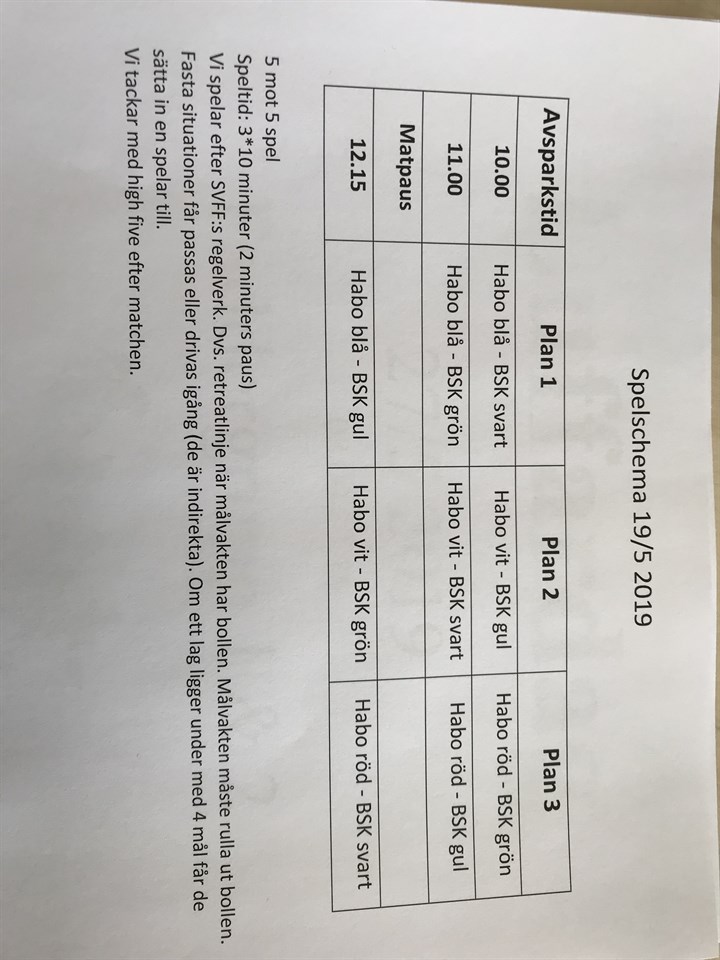 Här kommer lagindelning samt spelschema inför poolspelet mot Bankeryd på söndag. Habo blå: (Daniel & Magnus Ahlner) Axel Algot Elias Elvin Ludvig Malte Matt Max Robin G Sixten Habo vit: (Mikael & Johny) Alfred Edvard Elliot Emil Johannes Jorj Nils Olle Simon Theo Habo röd: (Martin E & Magnus Astenius) Alfons Ben Charlie Harry N Isac Melker Melvin Robin H Thor Vi kommer i detta poolspel ha ungdomsdomare som gör sina första domarinsatser. Så vänligen tänk på detta samt på vad och hur vi säger saker. P-11 15 maj 2019 0kommentarer